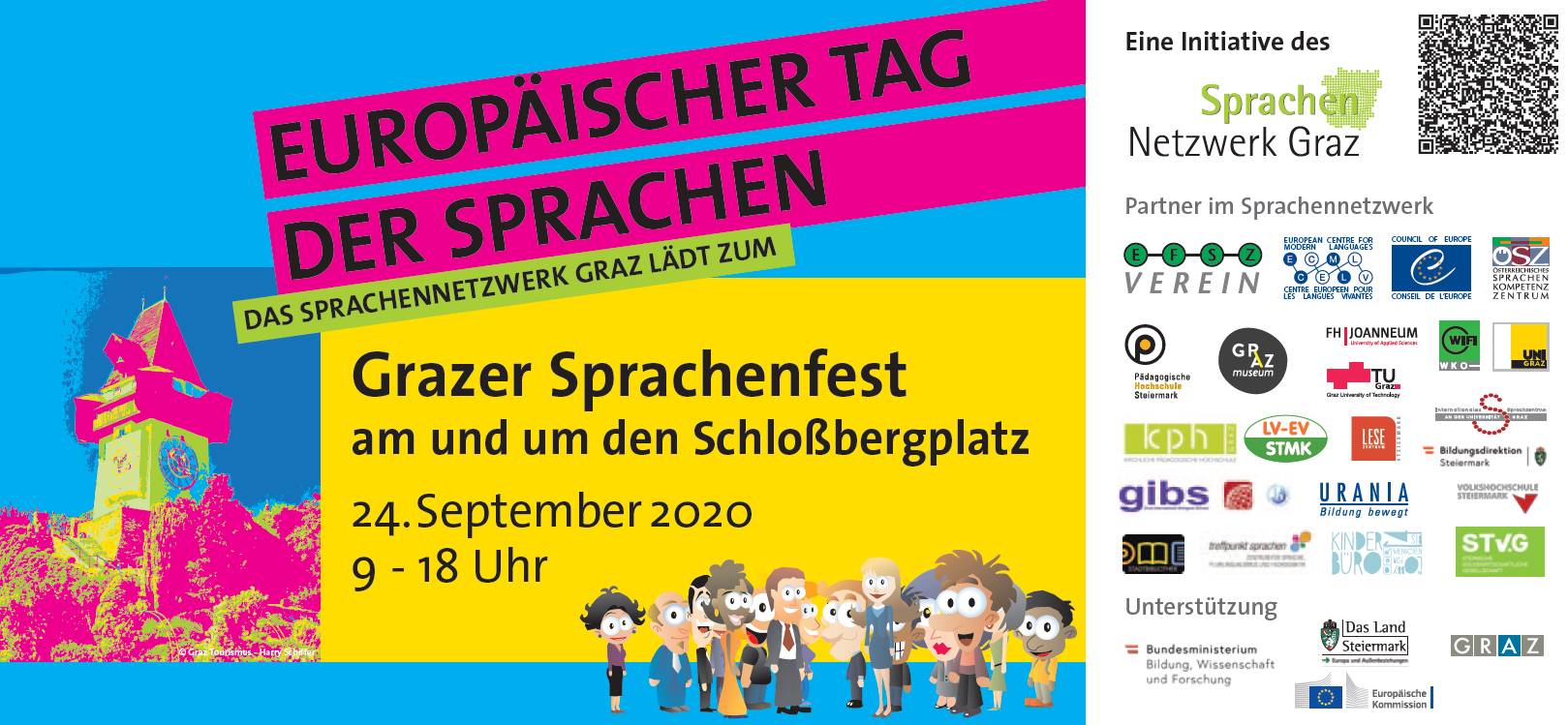 Auch heuer feiern das Sprachennetzwerk Graz und zahlreiche weitere Organisationen den Europäischen Tag der Sprachen mit einem Sprachenfest am und um den Schloßbergplatz. Viele Aktionsstände, eine Sprachenstrandbar mit Urlaubsfeeling, ein spannendes und vielfältiges Workshopprogramm sowie ein umfangreiches Kulturprogramm laden Kindergartenkinder, Schüler_innen und Erwachsene dazu ein, in die bunte Welt der Sprachen einzutauchen.