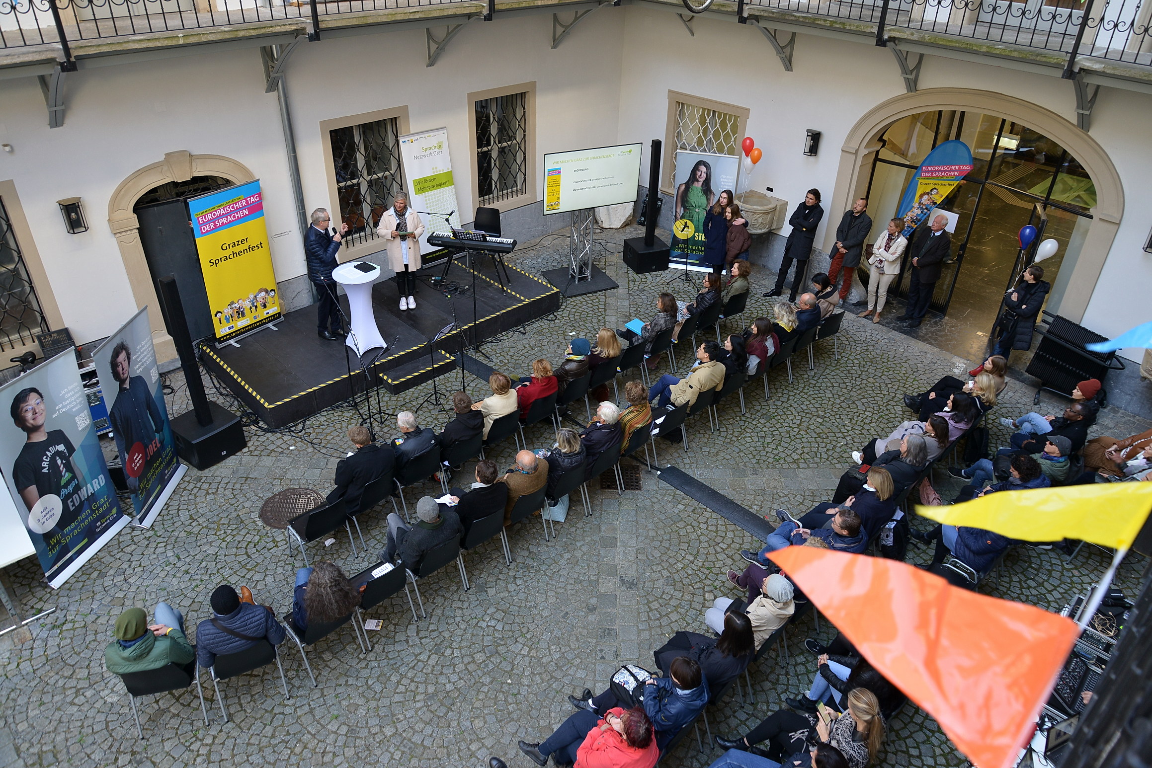 Das Sprachennetzwerk Graz und zahlreiche weitere Organisationen haben am 22.09.2022 bei etwas kühlerem aber schönem Herbstwetter zum 11. Grazer Sprachenfest gealden. Zahlreiche Aktionsstände haben zum Mitmachen motiviert, Workshops zu spannenden Themen rund um Sprache, Lernen und Kultur haben Schülerinnen und Schüler auf eine Reise mitgenommen und das Kaffee- und Teehaus der VHS, WIFI und URANIA lud zum Verweilen und Probieren typischer Tee- und Kaffeespezialitäten verschiedener Länder ein. Im malerischen Innenhof des Graz Museums wurde mit Musik, Tanz, Theater und tollen Erzählungen gemeinsam die Vielfalt der Stadt gefeiert. Auch unser e-Sprachenfest hatte zahlreiche Besucher:innen, die aus der Ferne am Kulturprogramm teilnehmen konnten oder aber die Möglichkeit des spielerischen Erkundens und Lernens bei Online-Workshops nutzten.